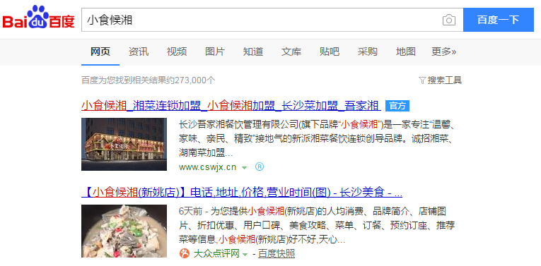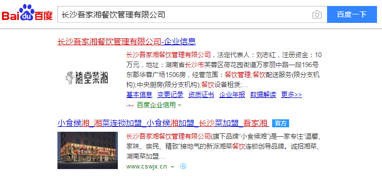 吾家湘餐飲一直希望能大力發(fā)展其品牌“小食候湘”的招商加盟,也非常注重互聯(lián)網(wǎng)方面的品牌營銷,為了在百度上有一個官方形象的展現(xiàn),吾家湘主動與我司合作,申請了百度官網(wǎng)認(rèn)證、商標(biāo)認(rèn)證等多個產(chǎn)品,認(rèn)證了其品牌“小食候湘”的官方標(biāo)識。目前百度搜索公司名稱、公司品牌,均可以在百度首頁看到其官方網(wǎng)站上的藍(lán)色“官方”標(biāo)識,對比此前未認(rèn)證前的搜索狀況,添加官方標(biāo)識之后,一方面鎖定了精準(zhǔn)用戶的流量,另一方面也樹立了品牌的官方形象,保護(hù)其品牌不被山寨、仿冒信息侵害。
